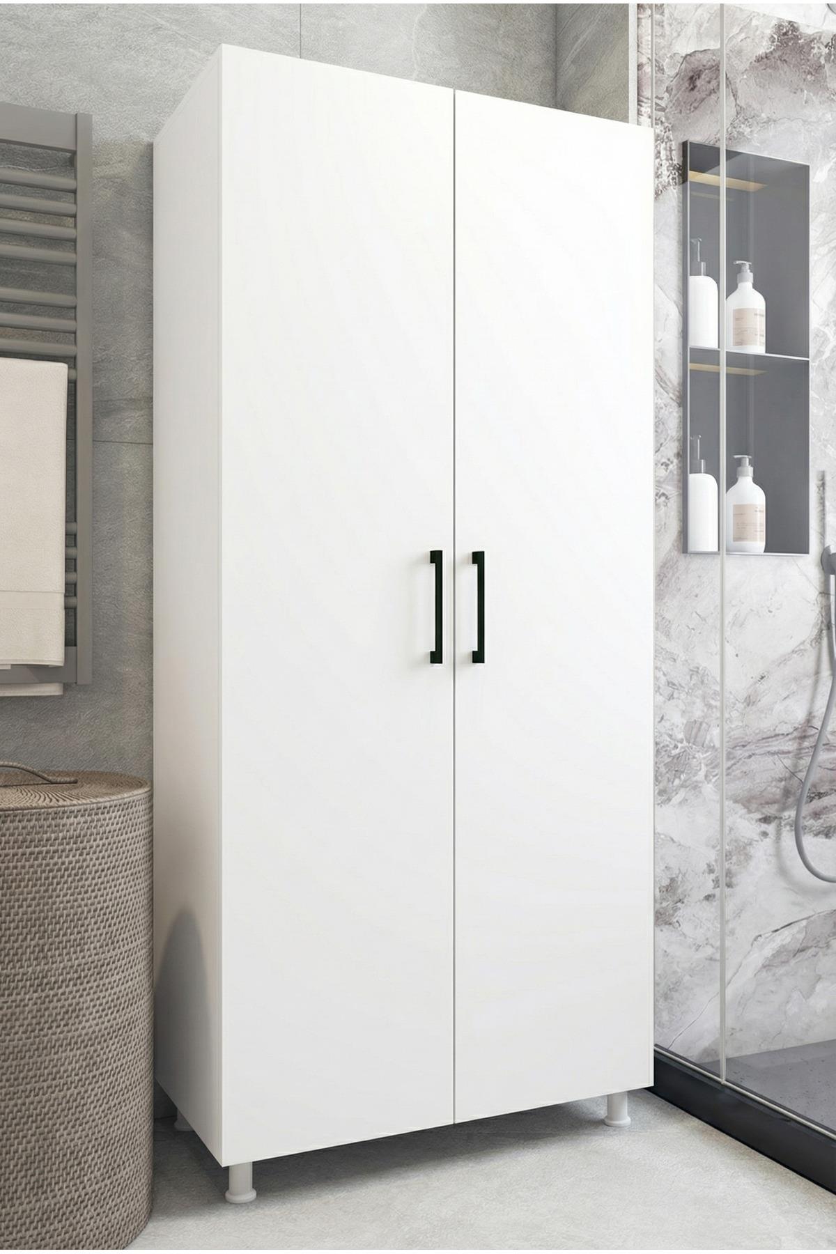 Banyo Dolabı Süpürgelik Kova Deterjan Saklama 2 Kapaklı Çok Raflı Beyaz 85x174 Cm
